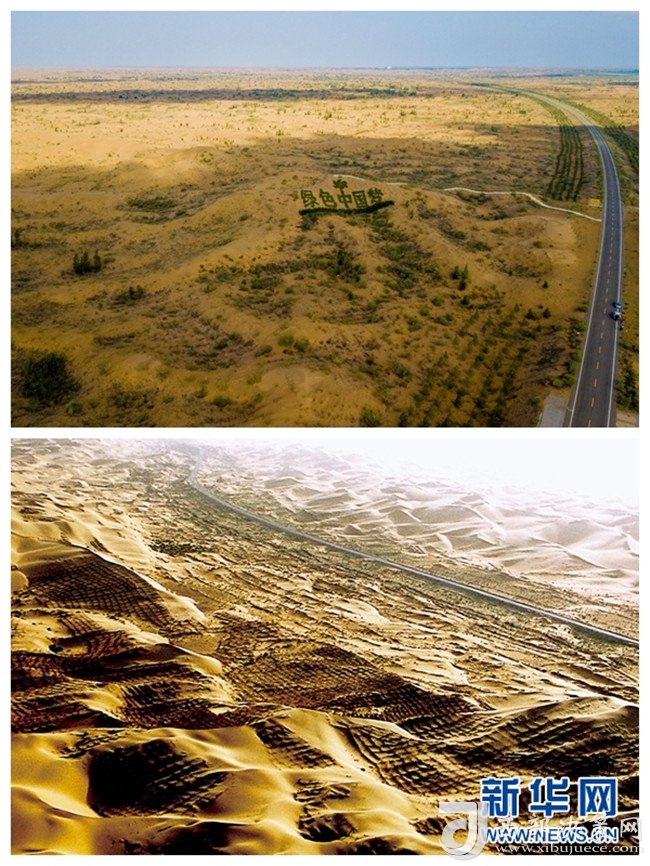 這是內(nèi)蒙古鄂爾多斯市杭錦旗庫布其沙漠穿沙公路周邊環(huán)境的對比(拼版照片:上為2018年7月11日新華社記者彭源攝;下為資料照片)。  新華社發(fā)