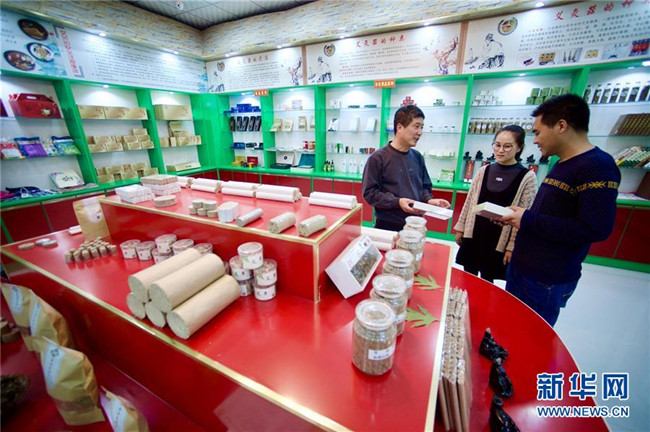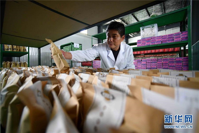 林玉清在寧夏固原市西吉縣寧夏澤艾堂生物科技有限公司查看艾草產(chǎn)品(8月30日攝)。來自福建莆田的林玉清2017年3月在西吉縣成立寧夏澤艾堂生物科技有限公司,依托西吉縣優(yōu)質(zhì)的艾草種植條件,采用“公司+合作社+農(nóng)戶”的訂單農(nóng)業(yè)合作模式,與吉強(qiáng)、新營等鄉(xiāng)鎮(zhèn)種植專業(yè)合作社合作建成艾草種植基地11個、推廣種植艾草6000畝,為當(dāng)?shù)厝罕娒撠氈赂讳伨托侣纷印P氯A社記者郭緒雷攝