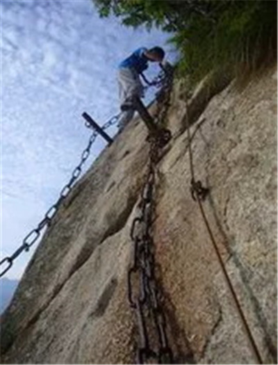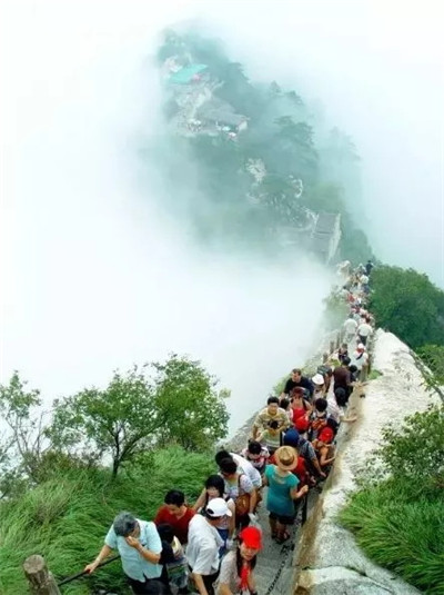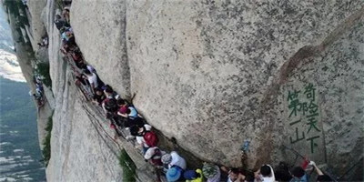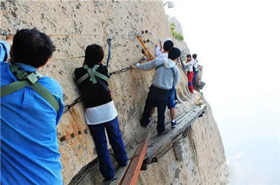 具有700多年歷史的長空棧道,在華山南峰東側山腰的萬仞絕壁上鑿出來的幾個踏腳之處,鑲嵌石釘搭木椽搭建了一個百余米懸空的棧道,讓人望而卻步,如果你有恐高癥,僅僅看一眼都會讓你驚恐萬分。2013年,著名旅游網(wǎng)站“Smarter Travel”盤點全球最恐怖懸崖步道,將華山長空棧道列為全球十大最恐怖的懸崖步道之一。