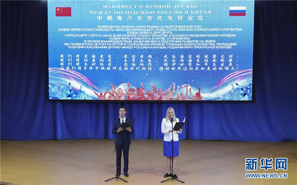 2018年9月12日,汶川地震后曾在兒童中心療養(yǎng)的北川男孩席浚斐(左)和中心輔導(dǎo)員娜塔莉亞共同宣讀《中俄青少年世代友好宣言》。 新華社記者謝環(huán)馳攝