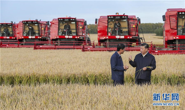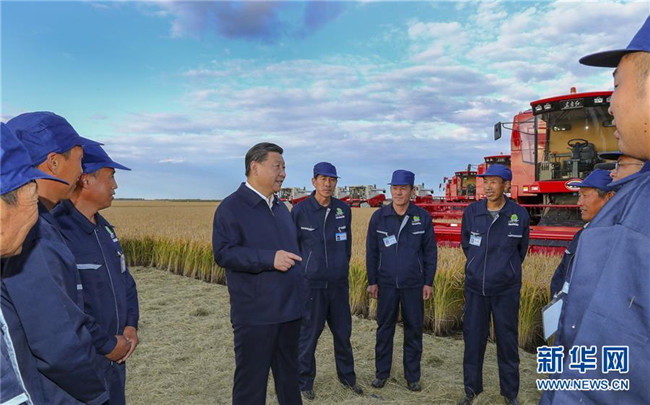 9月25日至28日,中共中央總書(shū)記、國(guó)家主席、中央軍委主席習(xí)近平在東北三省考察,主持召開(kāi)深入推進(jìn)東北振興座談會(huì)。這是25日下午,習(xí)近平在黑龍江農(nóng)墾建三江管理局七星農(nóng)場(chǎng)萬(wàn)畝大地號(hào)了解糧食生產(chǎn)和收獲情況。 新華社記者 謝環(huán)馳 攝