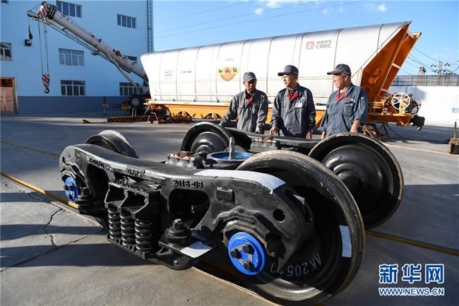 中車齊車集團有限公司教授級高工李向偉(中)介紹企業(yè)生產(chǎn)的重載技術(shù)領(lǐng)先的中交叉轉(zhuǎn)向架(9月26日攝)。 新華社記者王建威攝