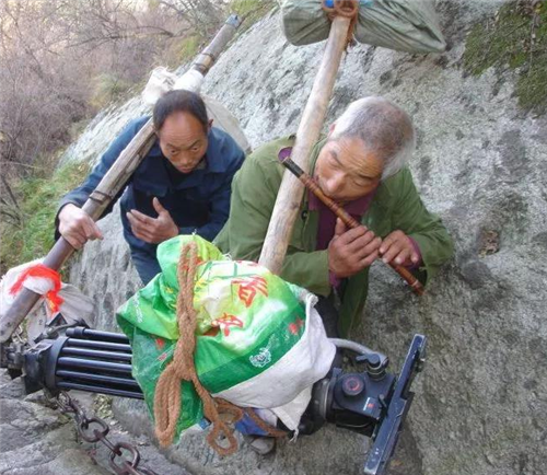 一副扁擔(dān)、一根長(zhǎng)繩,或者一個(gè)背簍、一根登山用的手杖就是華山挑山工掙錢養(yǎng)家的家伙什。