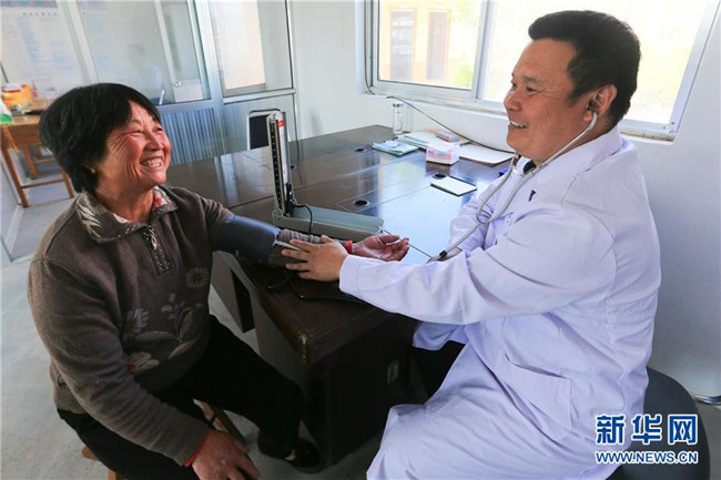 在山東蒙陰縣云夢湖生態(tài)區(qū)東汶社區(qū)的農(nóng)村幸福院養(yǎng)老院的醫(yī)務(wù)室,醫(yī)生為老人測量血壓(10月11日攝)。2016年,東汶社區(qū)將原來的村兩委大院擴(kuò)建為農(nóng)村幸福院養(yǎng)老院,委派專人負(fù)責(zé)老人們的一日三餐。同時按照“子女交納、集體補(bǔ)助、社會捐贈、財政獎勵”的模式設(shè)立孝心養(yǎng)老基金,每月定時發(fā)給貧困老人。新華社記者 王南 攝