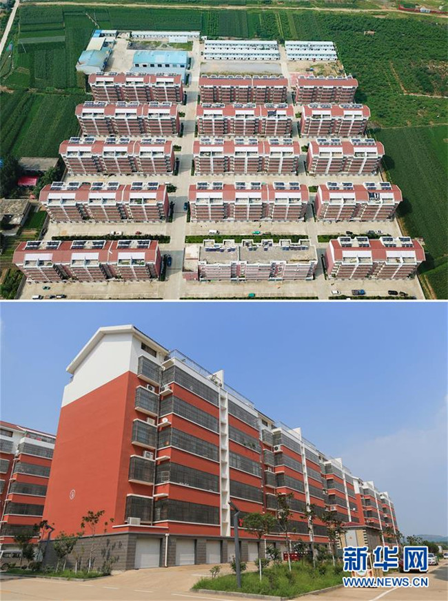 拼版照片(8月22日攝):上圖為無人機(jī)拍攝的山東費(fèi)縣朱田鎮(zhèn)崔家溝社區(qū);下圖為山東省臨沂市費(fèi)縣朱田鎮(zhèn)崔家溝社區(qū)的居民樓。崔家溝村是遠(yuǎn)近聞名的“光棍村”“貧困村中的貧困村”。2016年3月,崔家溝村在中央異地搬遷政策的扶持下,實現(xiàn)了整體搬遷,1600多口人搬到了鎮(zhèn)駐地。從此,昔日的“光棍村”,一躍進(jìn)入朱田鎮(zhèn)富裕村行列。新華社記者 王南 攝