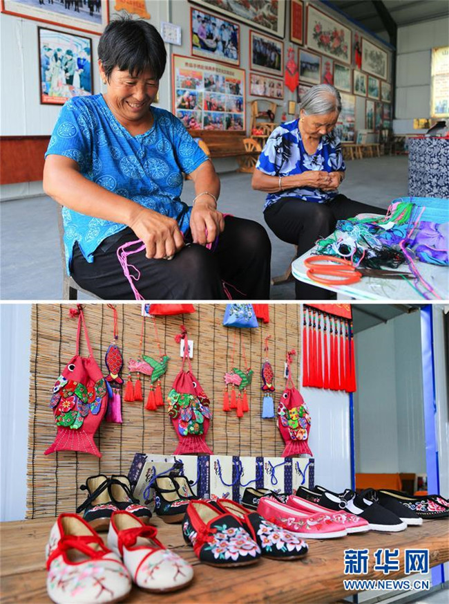 拼版照片(8月22日攝):上圖在山東費(fèi)縣朱田鎮(zhèn)崔家溝社區(qū)的居家靈活就業(yè)培訓(xùn)中心,當(dāng)?shù)卮迕裨诳p制手工飾品;下圖當(dāng)?shù)卮迕窨p制的手工飾品和布鞋(8月22日攝)。崔家溝村是遠(yuǎn)近聞名的“光棍村”“貧困村中的貧困村”。2016年3月,崔家溝村在中央異地搬遷政策的扶持下,實現(xiàn)了整體搬遷,1600多口人搬到了鎮(zhèn)駐地。從此,昔日的“光棍村”,一躍進(jìn)入朱田鎮(zhèn)富裕村行列。新華社記者 王南 攝