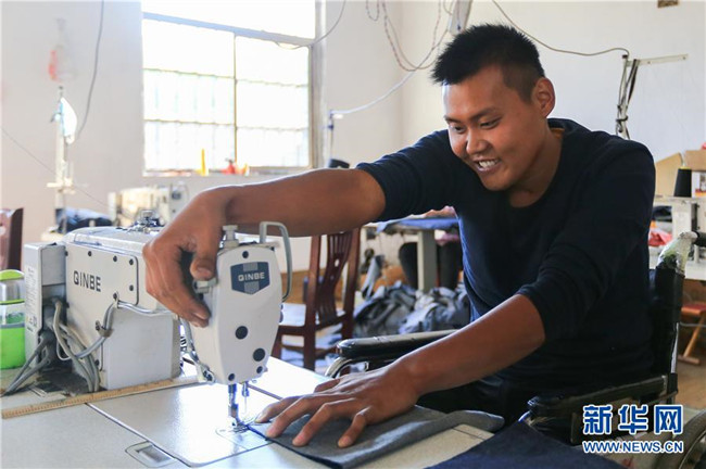 在山東蘭陵縣礦坑鎮(zhèn)朱柳屯村的扶貧車間,貧困戶范加誠操作縫紉機(jī)加工布料(10月10日攝)。今年29歲的范加誠八年前在建筑工地打零工時被因意外造成高位截癱。2016年,5萬元扶貧貸款為范加誠扶貧車間建設(shè)送來“及時雨”。一個月的時間,他就有了寬敞明亮的加工車間和8臺嶄新的縫紉機(jī)。新華社記者 王南 攝