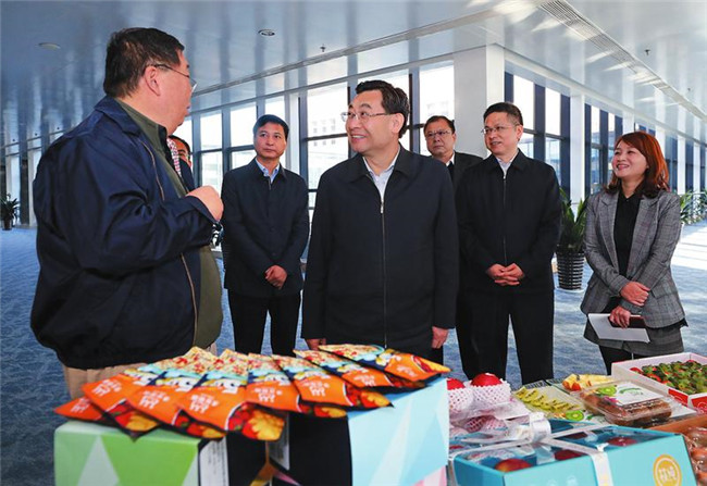 10月31日,省委書記胡和平深入西安市部分民營(yíng)企業(yè)調(diào)研。圖為他在海升集團(tuán)果業(yè)總部聽取產(chǎn)品種類、產(chǎn)業(yè)扶貧等情況介紹。 記者 宋紅梅攝