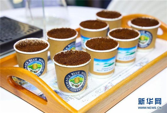 這是首屆中國國際進口博覽會加勒比地區(qū)國家展區(qū)牙買加展臺展出的藍山咖啡(11月6日攝)。新華社記者劉大偉攝