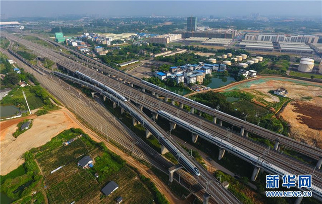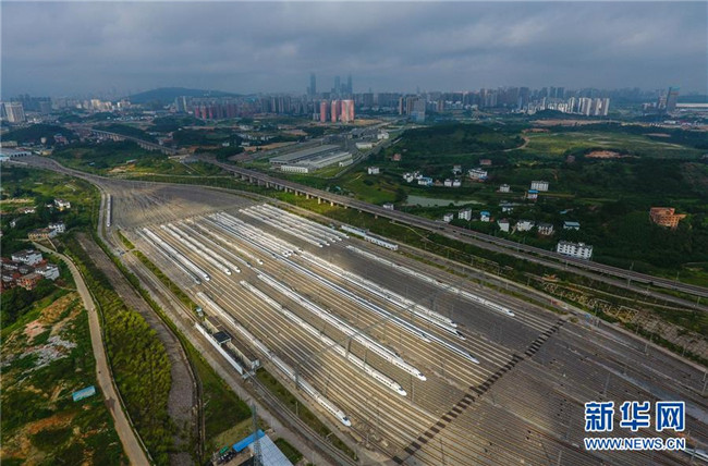 這是廣西南寧動(dòng)車(chē)所內(nèi)準(zhǔn)備發(fā)往各地的動(dòng)車(chē)組列車(chē)(7月1日無(wú)人機(jī)拍攝)。