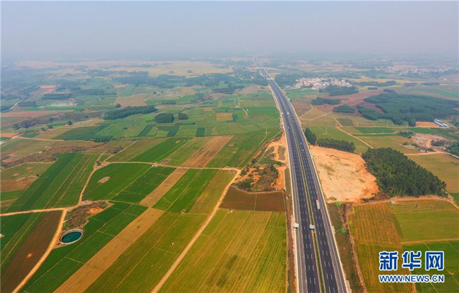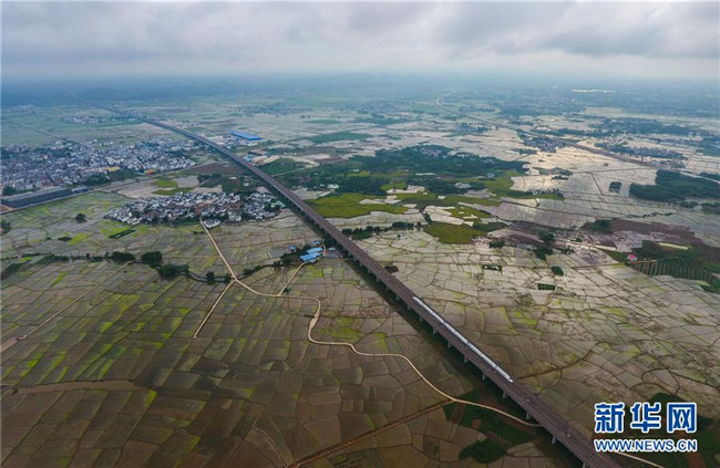 動(dòng)車(chē)在廣西南寧市的田野上行駛(2017年7月15日無(wú)人機(jī)拍攝)。