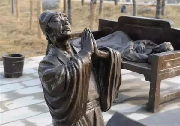 庾黔婁,南齊高士,任孱陵縣令。赴任不滿十天,忽覺心驚汗流,預感家中有事,當即辭官返鄉(xiāng)?;氐郊抑?,知父親已病重兩日。醫(yī)生囑咐說:“要知道病情吉兇,只要嘗一嘗病人糞便的味道,味苦就好。” 黔婁于是就去嘗父親的糞便,發(fā)現(xiàn)味甜,內(nèi)心十分憂慮,夜里跪拜北斗星,乞求以身代父去死。幾天后父親死去,黔婁安葬了父親,并守制三年。