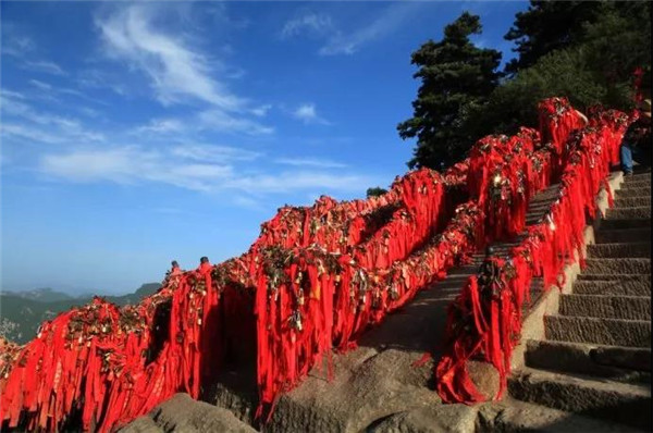 華山是愛情山,“洞房”一詞就源于華山西峰。相傳春秋時期在華山修行的吹簫人簫史和秦穆公的女兒弄玉就是在華山西峰相識相愛,由于山上沒有房屋,就在崖壁上鑿洞成婚,“洞房”一詞由此誕生。 如今來愛情山的游客都有了一個約定俗成的習(xí)慣,“進山先拜廟,相愛神知道”,“一把連心鎖,鎖定你和我”。相愛的情侶,不分年齡,不分國籍,不分信仰,來到山上都要進香上鎖,讓華山見證彼此的真心與愛意,祈求幸福美滿,人生甜蜜。
