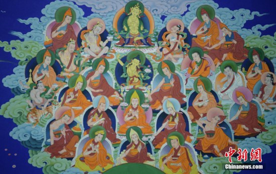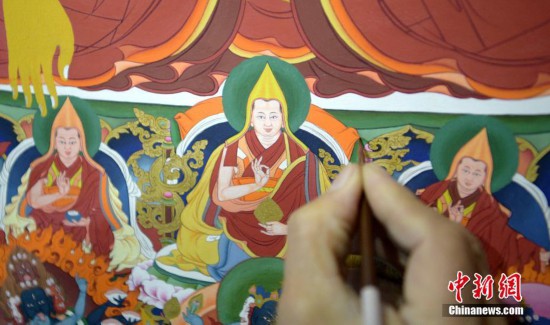 11月20日,四川爐霍,正在創(chuàng)作的巨幅唐卡畫局部。當(dāng)日,來自北京、四川、西藏、青海和甘肅的媒體記者走進(jìn)被譽(yù)為“唐卡之鄉(xiāng)”的四川爐霍,領(lǐng)略唐卡畫魅力。中新社記者 劉忠俊 攝