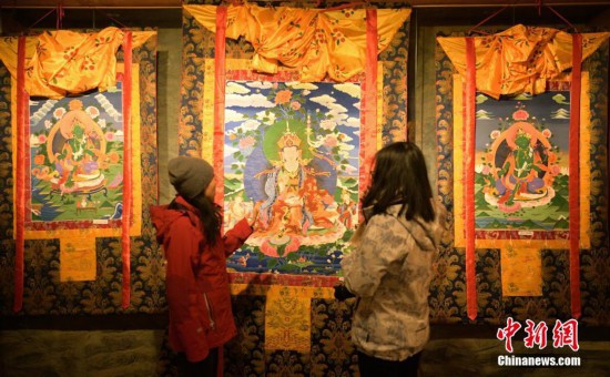 11月20日,四川爐霍,民族手工藝技術(shù)培訓(xùn)基地內(nèi)收藏的精美唐卡畫吸引參觀者。當(dāng)日,來自北京、四川、西藏、青海和甘肅的媒體記者走進(jìn)被譽(yù)為“唐卡之鄉(xiāng)”的四川爐霍,領(lǐng)略唐卡畫魅力。中新社記者 劉忠俊 攝