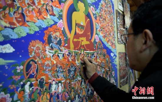 11月20日,四川爐霍,唐卡畫老師曲久正在創(chuàng)作一巨幅唐卡畫。當(dāng)日,來自北京、四川、西藏、青海和甘肅的媒體記者走進(jìn)被譽(yù)為“唐卡之鄉(xiāng)”的四川爐霍,領(lǐng)略唐卡畫魅力。中新社記者 劉忠俊 攝