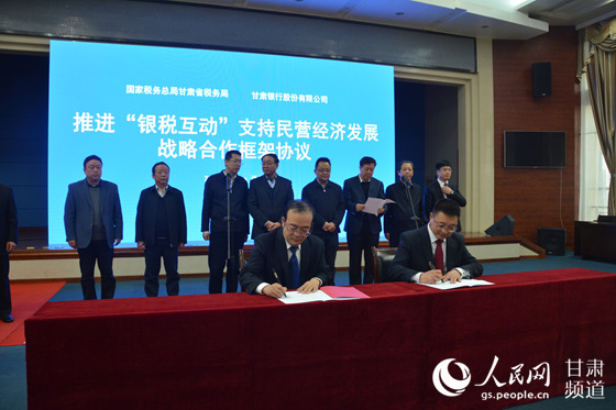 21日下午,甘肅省舉行“推進(jìn)‘銀稅互動(dòng)’支持民營經(jīng)濟(jì)發(fā)展戰(zhàn)略合作框架協(xié)議”簽約儀式。(牛蔓攝)