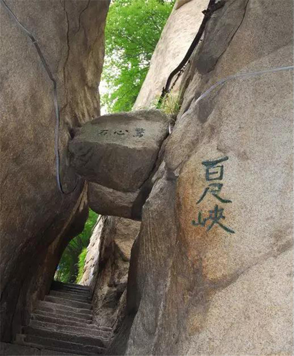 也叫“百丈崖”,過了千尺幢向北折即可到達(dá),是登華山的第二個(gè)險(xiǎn)境。這里山體峭陡壁立、四方如削,猶如斧子直辟而開,幾近垂直90度,在旁邊山體覆滿的墨綠植被的映襯下,華山的陽剛挺拔之態(tài)盡顯。和千尺幢一樣,百尺峽也是巖隙險(xiǎn)道,有石階91級,游人須挽鐵索而上。