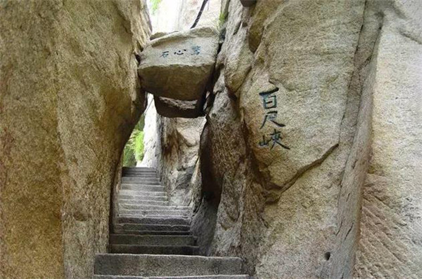 幢去峽復來,天險不可瞬。雖云百尺峽,一尺一千仞。”過千尺幢向北折即到“百尺峽”,它也叫“百丈崖”,仍是一處危石聳峙,直插云表,令人望而生畏的地方。峽的兩壁欲合,卻被飛來的兩顆石塊從中撐開,人從石頭下鉆過,膽戰(zhàn)心驚,生怕石塊從兩壁間掉下來,這就是“驚心石”。通過此石懸著的心才放下來,再回頭看原來此處卡著的兩塊石頭,是上大下小故能安然無恙,所以這顆石頭也被稱之為“平心石”。故韓愈詩中有“俄然神功就,殺氣見棱角”的描寫。