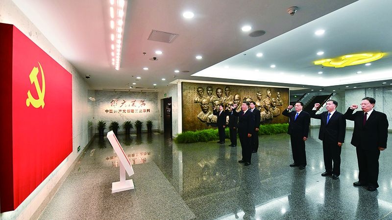 2017年10月31日,中共中央總書(shū)記、國(guó)家主席、中央軍委主席習(xí)近平帶領(lǐng)中共中央政治局常委李克強(qiáng)、栗戰(zhàn)書(shū)、汪洋、王滬寧、趙樂(lè)際、韓正,瞻仰上海中共一大會(huì)址和浙江嘉興南湖紅船。這是31日上午,在上海中共一大會(huì)址紀(jì)念館,習(xí)近平帶領(lǐng)其他中共中央政治局常委同志一起重溫入黨誓詞。 新華社記者 李濤/攝