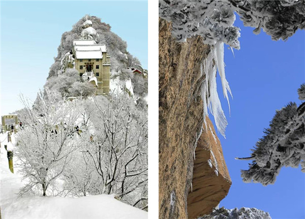 華山在11月進入冬季,12月至次年3月全山飄雪,而2月前為最旺雪期。游客可欣賞到難得一見的華山雪景——美麗的霧凇給樹木、巖石、屋舍都披上一層晶瑩的薄衣,尤其在大雪覆蓋后,山景變成一幅曼妙的白色圖畫,峰上的樹木和古藤被透明的冰層包裹,極富魅力。