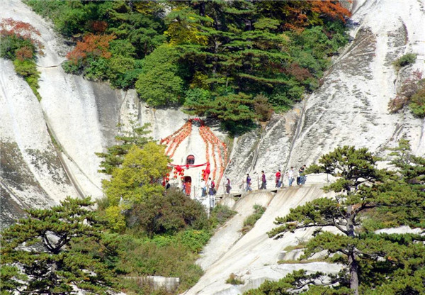 相傳秦穆公的女兒弄玉與居住在華山明星崖的吹簫人蕭史相愛后,練習(xí)辟谷之法,乘龍跨鳳,騰空來至華山,鑿洞成婚并得道成仙,“洞房”一詞也是源于此。情侶們來到這里拍照留念,也是對(duì)婚姻的一種向往。