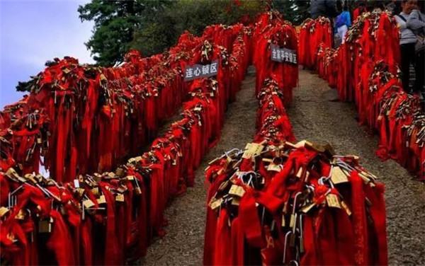 金鎖關(guān)北接五云峰,南控華山主峰,東西兩側(cè)壑深千丈,關(guān)前僅有一米寬的臺(tái)階石徑。環(huán)周古松蒼翠,奇石林立,常有祥云環(huán)繞,風(fēng)光非常迤麗。關(guān)內(nèi)關(guān)外登山路兩側(cè)鐵索上情侶鎖、平安鎖,重重疊疊,紅繩彩線迎風(fēng)搖曳,不失為關(guān)前一道美麗的風(fēng)景線。在這里,鎖住你對(duì)愛情的誓言,表達(dá)你堅(jiān)如磐石的愛情忠貞!