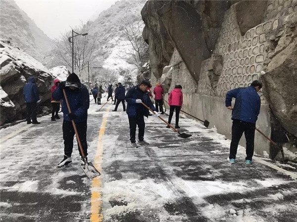 1月31日凌晨景區(qū)出現(xiàn)強降雪天氣,道路積雪嚴重影響行車安全。華旅集團第一時間多渠道發(fā)布景區(qū)推遲運營時間的信息,并向游客做好解釋工作,同時號召集團各部室、各單位迅速組織人員赴進山公路進行掃雪除冰,經(jīng)過三個小時的全力清掃,東線進山公路積雪清理完畢,景區(qū)在短時間內(nèi)恢復運營,西線索道進山公路及華山峪區(qū)域不斷加大清掃力度,盡力實現(xiàn)景區(qū)全線貫通。