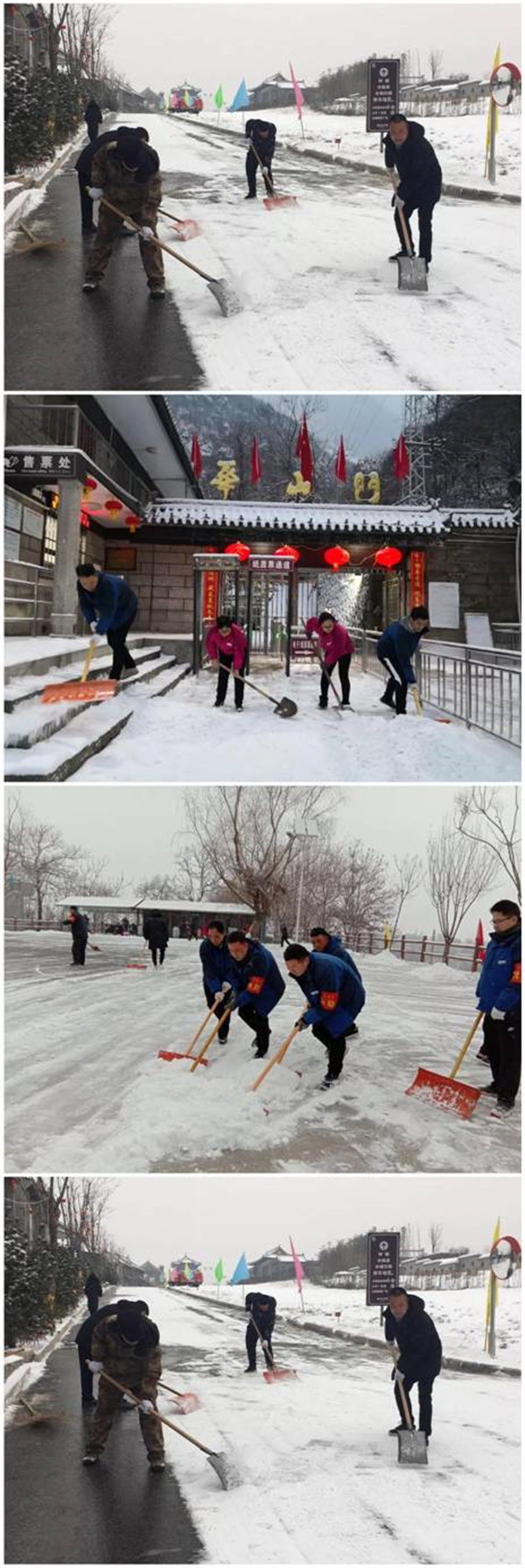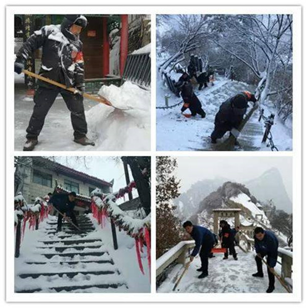 2月9日晚,一場(chǎng)大雪突降華山景區(qū),當(dāng)工作人員與游客一起沉浸在新年的喜悅氛圍時(shí),華山景區(qū)悄然鋪上了一層厚厚的積雪。2月10日早6時(shí),華旅集團(tuán)通過多渠道號(hào)召全體員工在各自崗位迅速開展掃雪除冰工作。雪情就是命令,來不及欣賞新年首場(chǎng)雪景,廣大員工扛起掃把鐵鍬等掃雪工具,第一時(shí)間奔赴“戰(zhàn)場(chǎng)”,全力確保景區(qū)恢復(fù)運(yùn)營(yíng)。