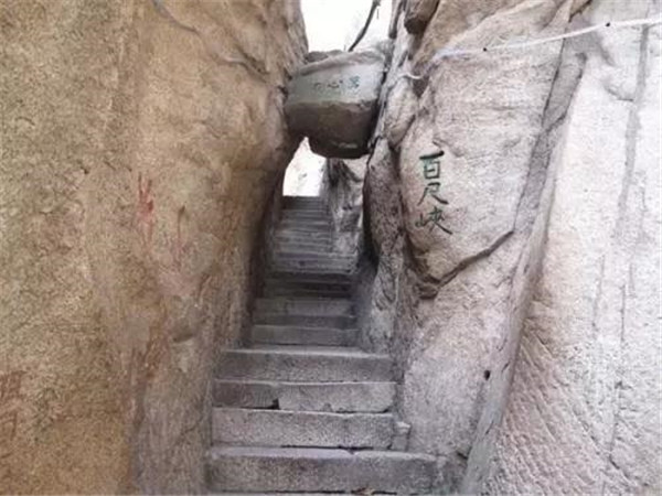 “千尺幢”在華山峪古道“回心石”上,是經(jīng)華山峪登主峰的必經(jīng)之道。這里原為一崖間裂隙,直立70度,后來人們沿隙鑿?fù)爻陕?,有石階370級,階寬僅容半足,游人登臨時,仰視一線天,俯視若臨深井。
