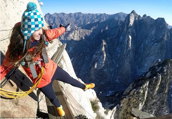 這是一個(gè)溫暖的美麗秋天,華山壯觀的峭壁在陽光下閃閃發(fā)亮,稀有樹木炫耀著多彩的秋葉,遠(yuǎn)方跳躍的瀑布吸引著游客的眼球,奇形怪狀的點(diǎn)點(diǎn)白云在腳下緩緩流動(dòng)。我和我的朋友開始了一場(chǎng)艱苦的旅行,一起攀登6,600多級(jí)鑿在巖石上的臺(tái)階,目標(biāo)是海拔2154.9米南峰之巔祭祀華山神的道觀?! ?