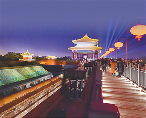 觀眾入場前,可觀賞午門城樓及東、西雁翅樓在燈光映照下的壯美雄姿。自午門入場后,首先觀賞點(diǎn)亮后的太和門廣場,隨后由午門西馬道登午門城樓,參觀“紫禁城里過大年”展覽,在東雁翅樓欣賞中央民族樂團(tuán)琵琶演奏家趙聰及其團(tuán)隊的演奏。結(jié)束午門展廳參觀后,觀眾沿著由紅燈籠點(diǎn)綴的城墻步行至東南角樓,觀看虛擬現(xiàn)實影片《角樓》,隨后來到東華門城樓,參觀“營造之道——紫禁城建筑藝術(shù)展”。當(dāng)走過近千米長的布滿紅燈籠的故宮東城墻時,可以看到臨近城墻西側(cè)的部分古建筑也被點(diǎn)亮,聆聽暢音閣戲樓傳來的戲曲聲。到達(dá)東北角樓后,觀眾步行至神武門,在這一區(qū)域可以觀賞到城墻南北兩側(cè)通過藝術(shù)燈光投影于建筑屋頂上的《千里江山圖》等作品,從而產(chǎn)生人在畫中游的感覺。離開神武門城樓后,神武門外東、西兩側(cè)的角樓餐廳和角樓咖啡靜候光臨,從而結(jié)束此次“上元之夜”文化活動。