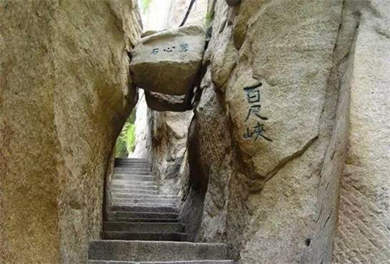 幢去峽復來,天險不可瞬。雖云百尺峽,一尺一千仞。”過千尺幢向北折即到“百尺峽”,它也叫“百丈崖”,仍是一處危石聳峙,直插云表,令人望而生畏的地方。峽的兩壁欲合,卻被飛來的兩顆石塊從中撐開,人從石頭下鉆過,膽戰(zhàn)心驚,生怕石塊從兩壁間掉下來,這就是“驚心石”。通過此石懸著的心才放下來,再回頭看原來此處卡著的兩塊石頭,是上大下小故能安然無恙,所以這顆石頭也被稱之為“平心石”。故韓愈詩中有“俄然神功就,殺氣見棱角”的描寫。