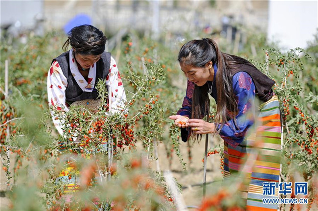 在西藏白朗縣,一家生態(tài)觀光產(chǎn)業(yè)園的員工在采摘枸杞(2018年9月5日攝)。新華社記者 張汝鋒 攝