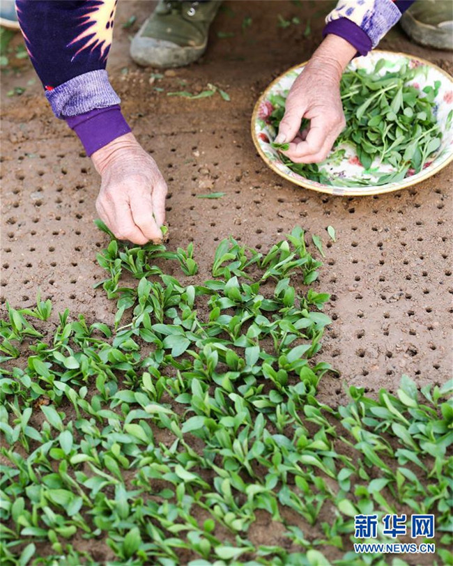 3月11日,在明光市管店鎮(zhèn)甜葉菊育苗扶貧基地,農(nóng)戶(hù)在扦插甜葉菊苗。 新華社記者 曹力 攝
