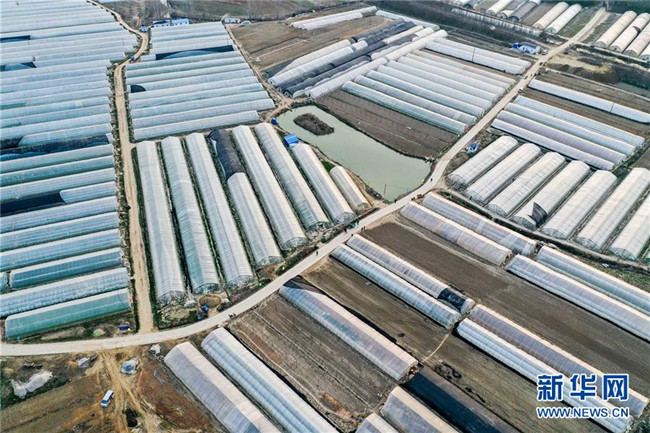 3月11日無(wú)人機(jī)拍攝的明光市管店鎮(zhèn)甜葉菊育苗扶貧基地一角。 新華社記者 曹力 攝