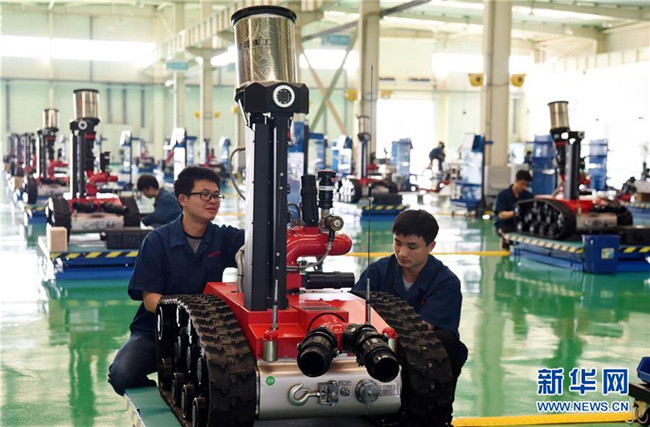 2018年3月30日,員工在位于江西共青城的中信重工開誠(chéng)智能裝備有限公司生產(chǎn)基地組裝防爆消防滅火偵察機(jī)器人。 新華社記者 宋振平 攝