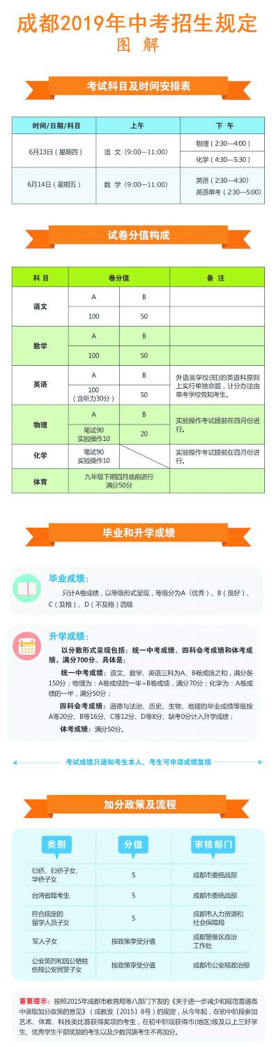 今年中考考試時間與往年一樣,為6月13日、14日,考試科目和計分辦法均未作調(diào)整。也即是說,今年中考統(tǒng)一考試科目依然為語文、數(shù)學、英語、物理、化學、體育六科。其中,物理、化學包括實驗操作考試。體育考試以及物理、化學實驗操作考試在九年級下期4月底以前,由各區(qū)(市)縣組織進行。九年級結(jié)束時,語、數(shù)、英、物、化五科的畢業(yè)考試與升學考試一并進行,各科筆試考試均為閉卷考試,具體時間安排詳見圖解。其中,外語類學校(班),如成外實外等校的英語科,原則上單獨命題,統(tǒng)一考試。