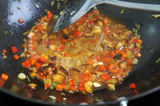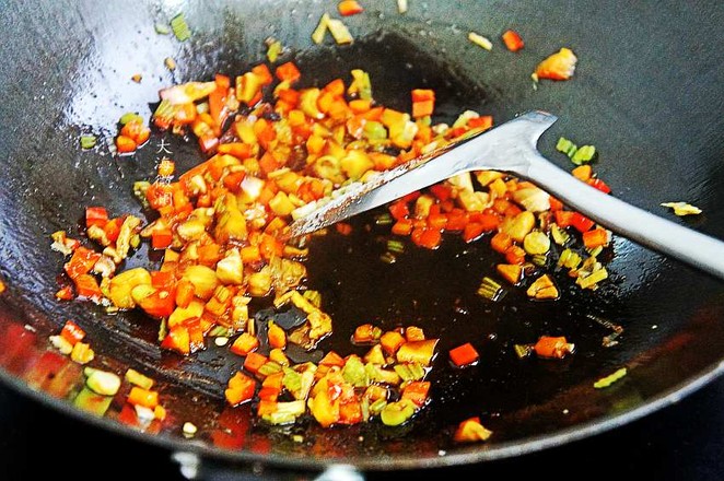 2.青椒、紅椒洗凈切小丁,香菇洗凈焯水后再洗凈切丁,蔥姜去皮洗凈切碎