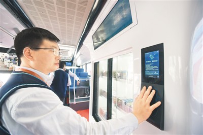 2019中國(上海)國際技術(shù)進出口交易會上,工作人員在智能熊貓巴士上演示利用掌脈進行購物。龍巍 攝(人民視覺)