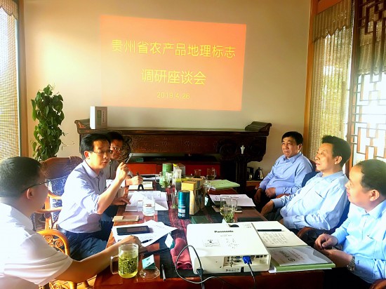 肖榮軍副廳長(左二)在向調(diào)研組一行介紹貴州省農(nóng)產(chǎn)品地理標(biāo)志相關(guān)情況