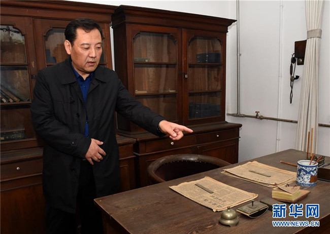 北京新文化運(yùn)動(dòng)紀(jì)念館副館長(zhǎng)李金光在北大紅樓中介紹當(dāng)年圖書(shū)館主任李大釗的辦公室(4月9日攝)。新華社發(fā)(任超 攝)