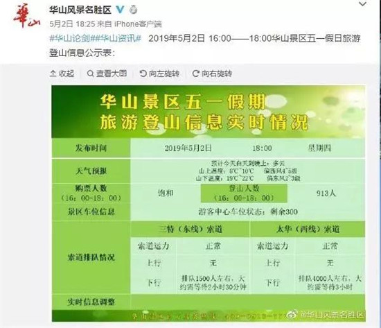 在五一小長(zhǎng)假期間游客朋友們還可以通過(guò)關(guān)注@華山風(fēng)景名勝區(qū)新浪微博或者通過(guò)景區(qū)LED電子大屏準(zhǔn)確知曉各個(gè)時(shí)間段的登山人數(shù),以便合理調(diào)整自己的游覽計(jì)劃。