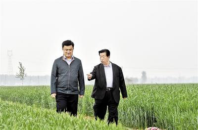 國務(wù)院發(fā)展研究中心專家、大名縣掛職縣委常委、副縣長吳平(左)與萬北村黨總支書記董可志探討萬北村鄉(xiāng)村振興發(fā)展之路。 記者 耿輝攝