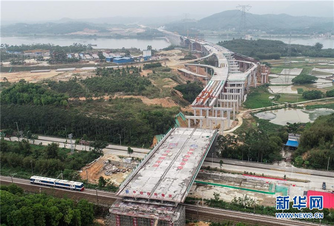 4月2日,由廣東省交通集團(tuán)投資建設(shè)、中鐵四局承建的汕(頭)湛(江)高速公路北江特大橋跨京廣鐵路、國道G240轉(zhuǎn)體橋成功轉(zhuǎn)體,這是轉(zhuǎn)體橋轉(zhuǎn)體后的位置(無人機(jī)拍攝)。 新華社記者 劉大偉 攝