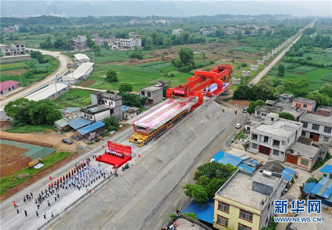 在廣西都安瑤族自治縣貴南高鐵澄江雙線特大橋施工現(xiàn)場,工人在架設(shè)大橋首榀箱梁(4月29日無人機(jī)拍攝)。 新華社記者 陸波岸 攝