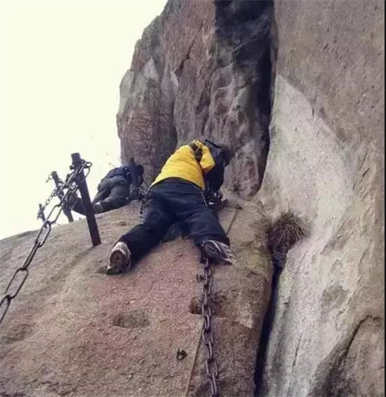 具有700多年歷史的長(zhǎng)空棧道,在華山南峰東側(cè)山腰的萬(wàn)仞絕壁上。鑿出來(lái)的幾個(gè)踏腳之處,鑲嵌石釘搭木椽搭建了一個(gè)百余米懸空的棧道,讓人望而卻步。如果你有恐高癥,僅僅看一眼都會(huì)讓你心驚膽戰(zhàn)。2013年,著名旅游網(wǎng)站“Smarter Travel”盤點(diǎn)全球最恐怖懸崖步道,將華山長(zhǎng)空棧道列為全球十大最恐怖的懸崖步道之一。