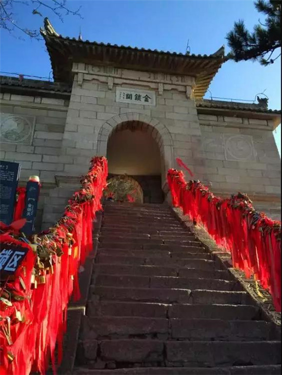 關(guān)內(nèi)關(guān)外登山路兩側(cè)的鐵索上掛滿了成千上萬(wàn)枚的情侶鎖、平安鎖,人們?cè)诖肆粝旅篮玫募恼Z(yǔ)、囑托、祝福、祈盼。