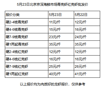 水產(chǎn)養(yǎng)殖網(wǎng)今早上傳的5月23日北京京深海鮮市場紅殼蝦青殼蝦批發(fā)價顯示,個頭最小(2-4錢/只)、最便宜的小龍蝦批發(fā)價僅需11元/斤,比昨天又降了1元。而湖南、江蘇、廣東等地的價格也和北京差不多,武漢甚至低至9元/斤。