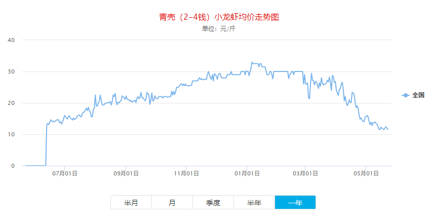 小龍蝦價格網(wǎng)上發(fā)布的全國小龍蝦批發(fā)價走勢圖也顯示,近日價格為一年中的低點(diǎn),均價在11元上下。